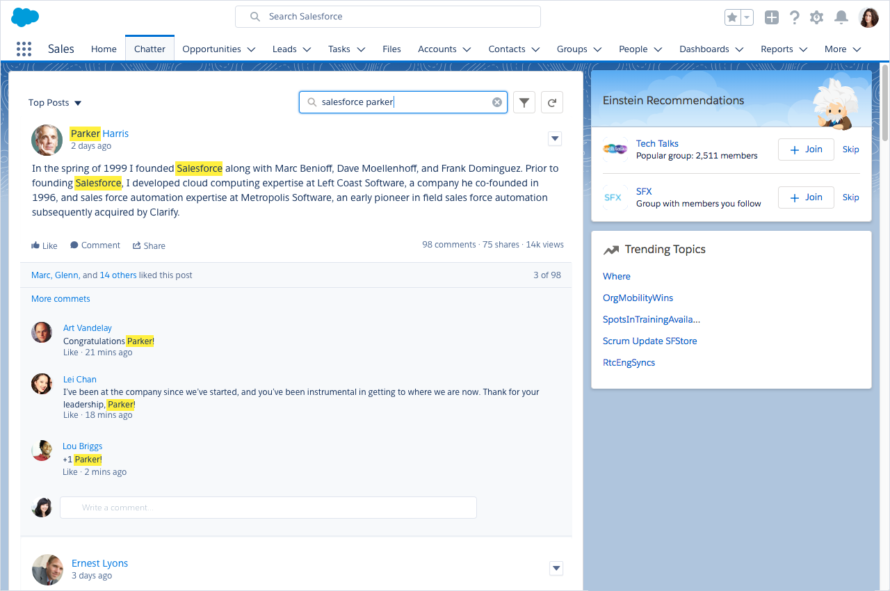 Highlight anywhere there's a match, including the name of the poster or commenters, the body of the post, the comments, and attachments. When a user clicks on the publisher, expand all comments to give a full context of the conversation.